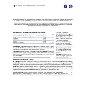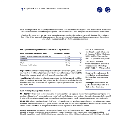 Zonnebloemolie, omega 3 vetzuren (vis), L-ornithine, L-lysine, L-arginine, vulstoffen (lecithine uit zonnebloem, witte bijenwas), foliumzuur (vitamine B11).