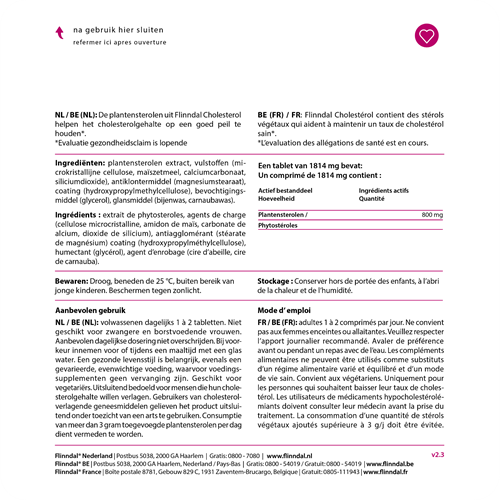 Flinndal Cholesterol is een plantaardige hulp voor het behoud van normale cholesterolgehalten in uw bloed. Het bevat 800 mg plantensterolen per tablet, uit soja. Dat is precies de hoeveelheid waarover de Europese Unie oordeelt dat het helpt voor het behoud van een verantwoord cholesterolgehalte.