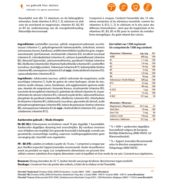 Flinndal Multi Kauwtablet bevat alle 13 vitaminen en de belangrijkste mineralen in een dosering tot 100% van de aanbevolen dagelijkse hoeveelheid. Met alle B-vitaminen en magnesium voor de energiehuishouding en vitamine C, D en zink voor de weerstand. Alle ingrediënten zijn goed opneembaar. Zoals vitamine D3, K2 en natuurlijke vitamine E. Eén kauwtablet per dag is een complete aanvulling op uw voeding. Op smaak gebracht met natuurlijke zoetstoffen.
