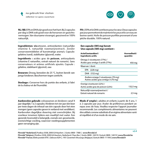 - EPA en DHA zijn allebei vetzuren van de omega-3 familie en komen voor in vette vis. Doordat het lichaam deze stoffen niet (of niet voldoende) zelf kan aanmaken, is het belangrijk om deze op een andere manier in te nemen. Flinndal Omega-3 Forte bevat per capsule genoeg EPA (eicosapentaeenzuur) en DHA (DocosaHexaeen Acid) voor een gunstige invloed op uw hart. Wilt u het ook voor uw hersenen en ogen, neem dan 2 capsules per dag.
